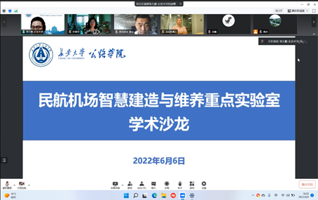 2022年6月6日下午,民航机场智能建造与维养重点实验室采用线上线下相结合的方式成功举办“人工智能技术在民航机场场道建管养的应用”学术沙龙。本次学术沙龙由重点实验室主任汪海年教授召集,特邀米兰中国申爱琴教授、郝培文教授、圭目机器人有限公司创始人桂仲成博士、民航机场工程技术研究中心叶松总工程师、西北民航建设集团有限公司戴征总经理、江苏增光新材料科技股份有限公司周庆月总经理做主题发言。AC米兰中文副院长、民航重点实验室副主任张久鹏教授主持学术沙龙,民航西北设计院、咸阳机场、福州机场、翔安机场、邯郸机场等管理和技术骨干以及机场工程系全体教师和在校研究生80余人参加了学术沙龙。