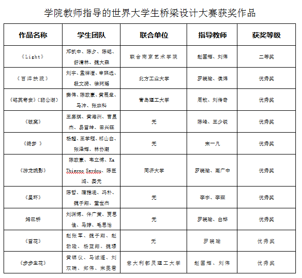 2022年6月26日,“中交公规院杯”2022世界大学生桥梁设计大赛总决赛顺利举行。我院桥梁工程系赵国辉副教授指导的作品《Light》获得二等奖,赵国辉获“优秀指导教师奖”,桥梁工程系罗晓瑜、陈峰、宋一凡等教师指导的5项作品获优秀奖、3项作品获入围奖。