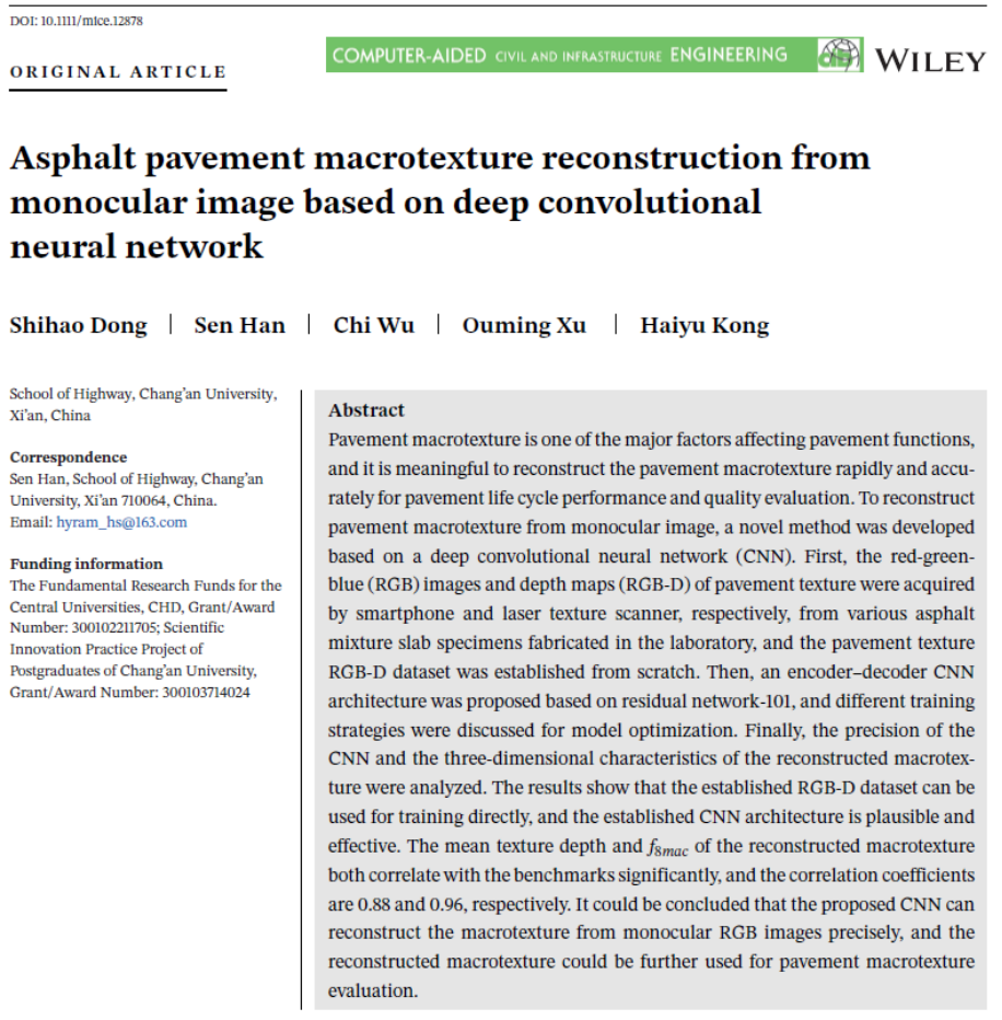 近日,我校AC米兰中文博士生董仕豪在导师韩森教授和徐鸥明教授共同指导下,在土木工程领域顶级期刊《Computer-Aided Civil and Infrastructure Engineering》发表研究论文“Asphalt pavement macrotexture reconstruction from monocular image based on deep convolutional neural network”( 基于深度卷积神经网络的单目图像的沥青路面宏观纹理重构)。