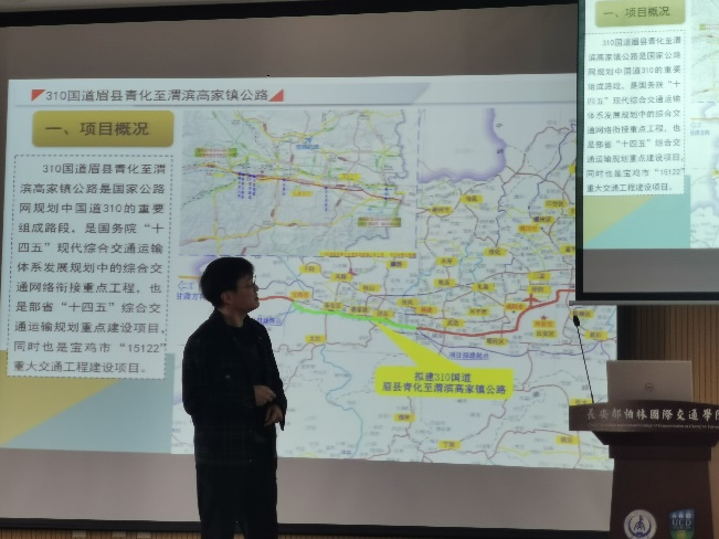 3月14日,胡建荣对2022届道路方向全英文毕业设计校企联合指导进行了简要总结,对2023届本科毕业设计校企联合指导提出了要求。高级工程师周茂以310国道眉县至渭滨一级公路为例,详细讲述了路线方案设计及关键性技术问题处理。