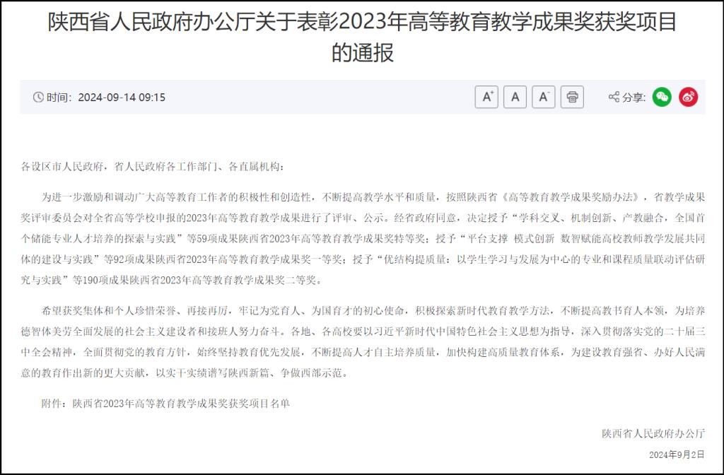 近日,陕西省人民政府发布《陕西省人民政府办公厅关于表彰2023年高等教育教学成果奖获奖项目的通报》(陕政办函〔2024〕104号),AC米兰中文共3项成果获奖,其中特等奖1项,一等奖1项,二等奖1项。