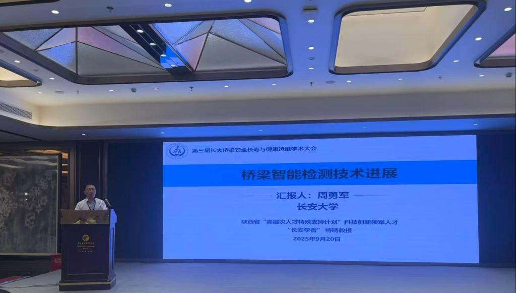 大会期间,周勇军教授受邀作了题为《桥梁智能检测技术研究进展》的专题报告,系统介绍了我院长大智慧桥梁团队在桥梁智能检测技术和设备创新与重大工程应用等方面取得的研究成果与经验。张岗教授以《钢结构桥梁防火技术与规范编制》为题,受邀分享了课题组在钢结构桥梁耐火性能分析、防火技术研发及相关规范编制方面的研究内容与重要进展。