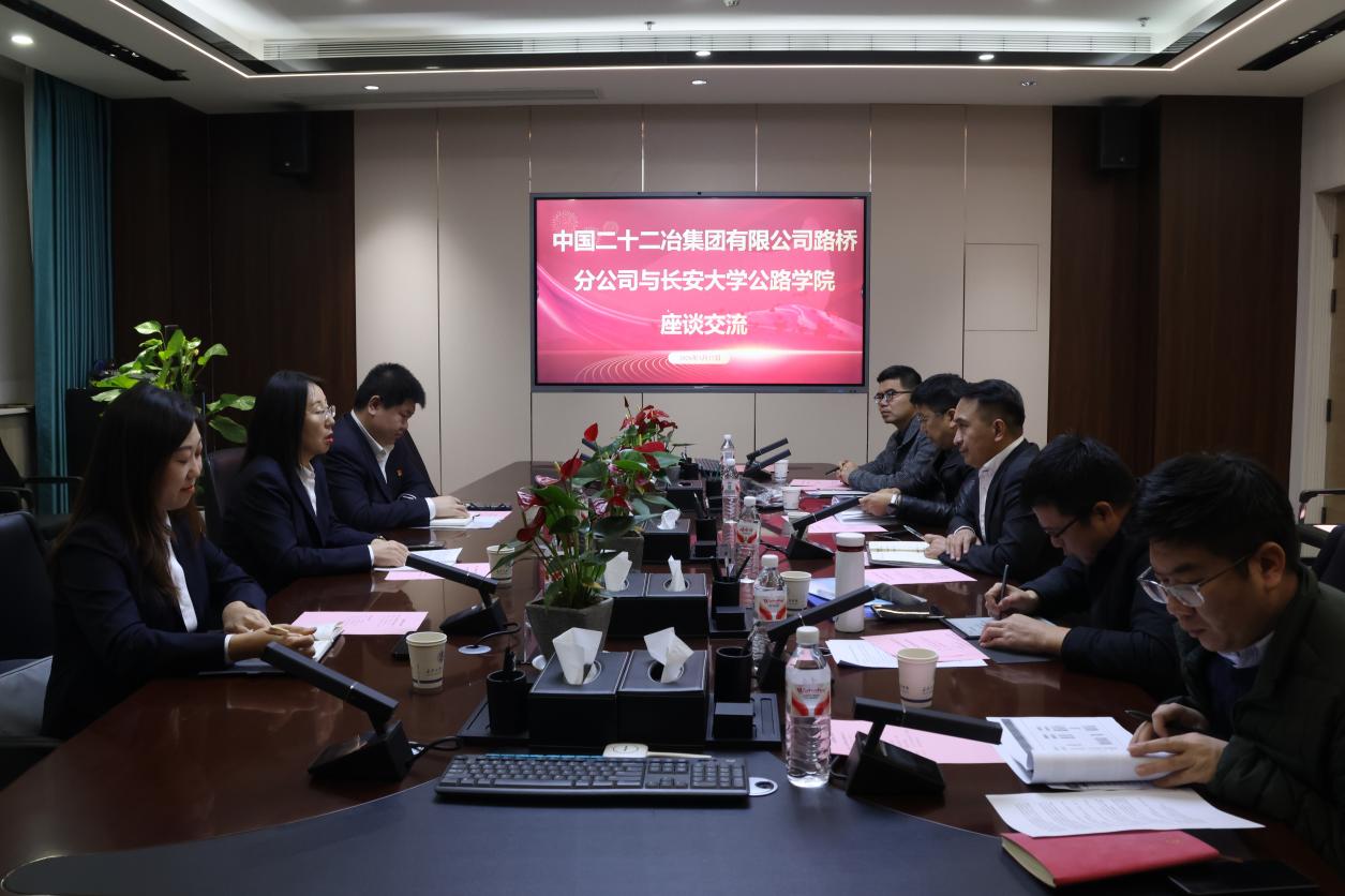中国二十二冶集团有限公司路桥分公司技术质量部科创中心主任张佐铭、主办科员周爽,AC米兰中文道路工程系主任纪小平、教授蒋应军等参加座谈。