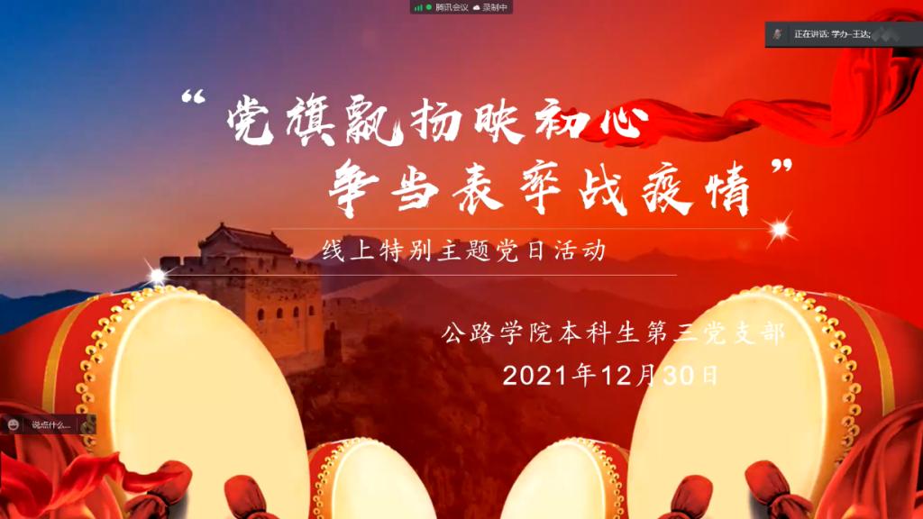 本科生第一党支部于2021年12月30日晚组织开展了“党旗飘扬映初心争当表率战疫情”线上特别主题党日活动,活动分为深入学习党的十九届六中全会精神、重温和学习伟大抗疫精神、支部成员抗疫志愿服务工作感悟分享三部分进行。活动最后由郭洋老师进行总结,她对支部各位学生党员志愿者近期的工作予以充分的肯定,并提醒大家加强个人防护,保障自身安全,做到劳逸结合。