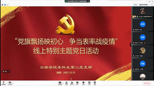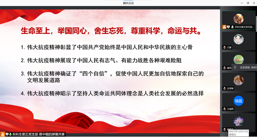 本科生第五党支部于2021年12月31日晚18:00开展了“党旗飘扬映初心争当表率战疫情”线上特别主题党日活动,本次会议由支部副书记蒋中楷主持,第五党支部全体党员参加。本次会议继续深入学习了党的十九届六中全会精神,依托全会精神强调了坚定理想信念的重要性;同时重温了伟大抗疫精神并对半个多月来的抗疫志愿服务工作进行总结,安排和部署了下一阶段支部的抗疫工作。