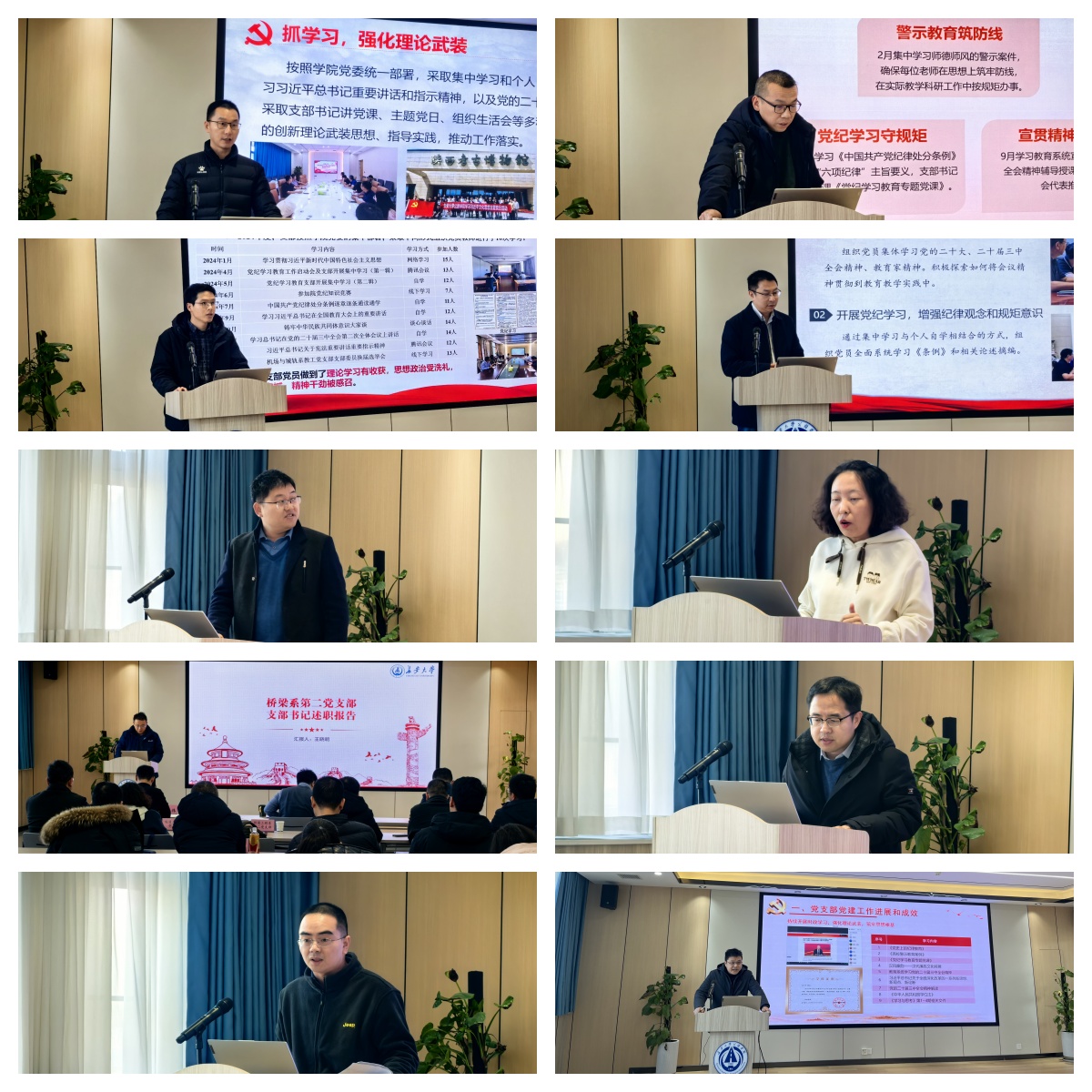 会上,各党支部书记围绕支部概况、“三会一课”制度落实情况、党员队伍建设与培养的“七个有力”等方面依次上台述职汇报,全面总结了支部本年度党建工作的进展和成果。教工党支部着重介绍了支部党建工作与业务工作融合的情况以及支部开展的特色活动,学生党支部重点介绍了支部党员教育管理工作与学业学风建设互促举措。各党支部认真分析了当前建设中存在的问题与不足,并提出了富有针对性的改进举措和务实的工作计划,随后进行现场民主测评。
